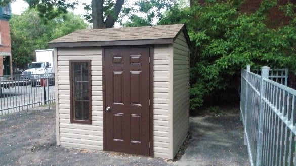 Small shed installed for city of Montreal at St. Dominique Community Garden. 6×8 Preference model with door, window and cornices in Muscade Brown.